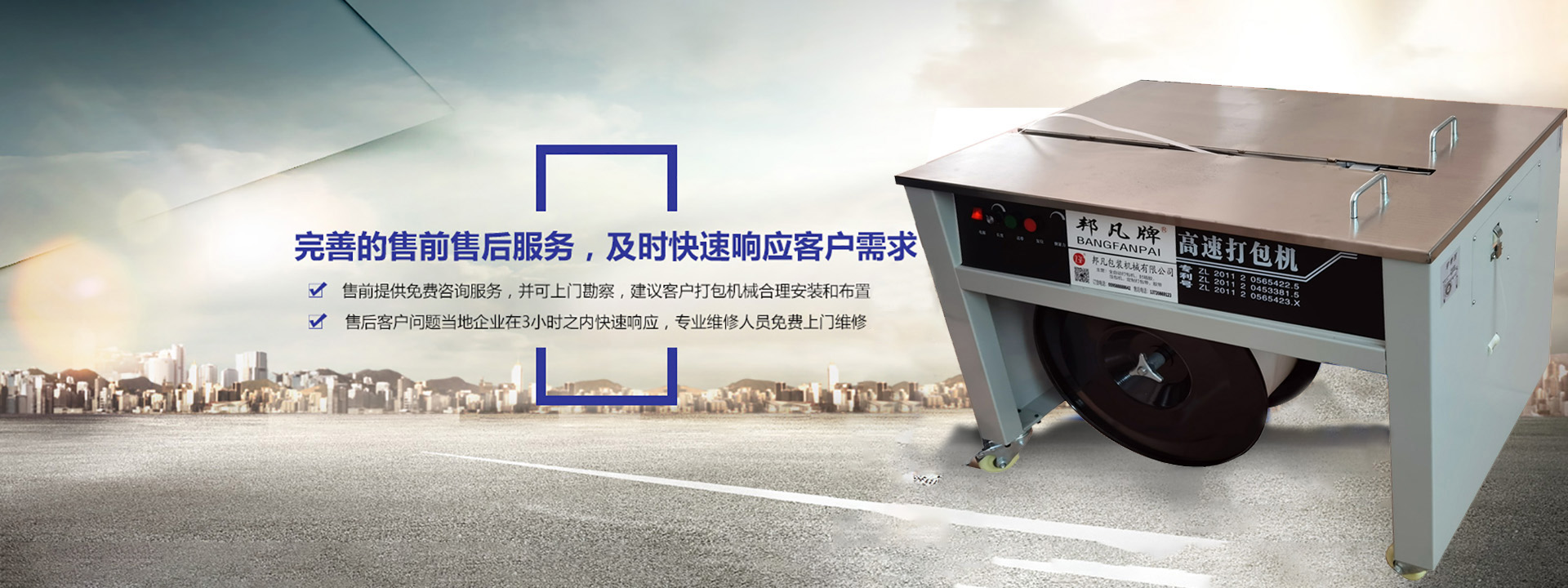 邦凡包装用品有限公司 邦凡包装用品有限公司 始创于2007年,数年来,公司秉承质量优先,服务至上的原则,赢得了客户的信赖。 公司主要生产经营:邦凡牌自动打包机、自动封箱机、全自动打包机等,大型设备有自动封箱打包生产线、全自动包装流水线、自动包装生产线等。